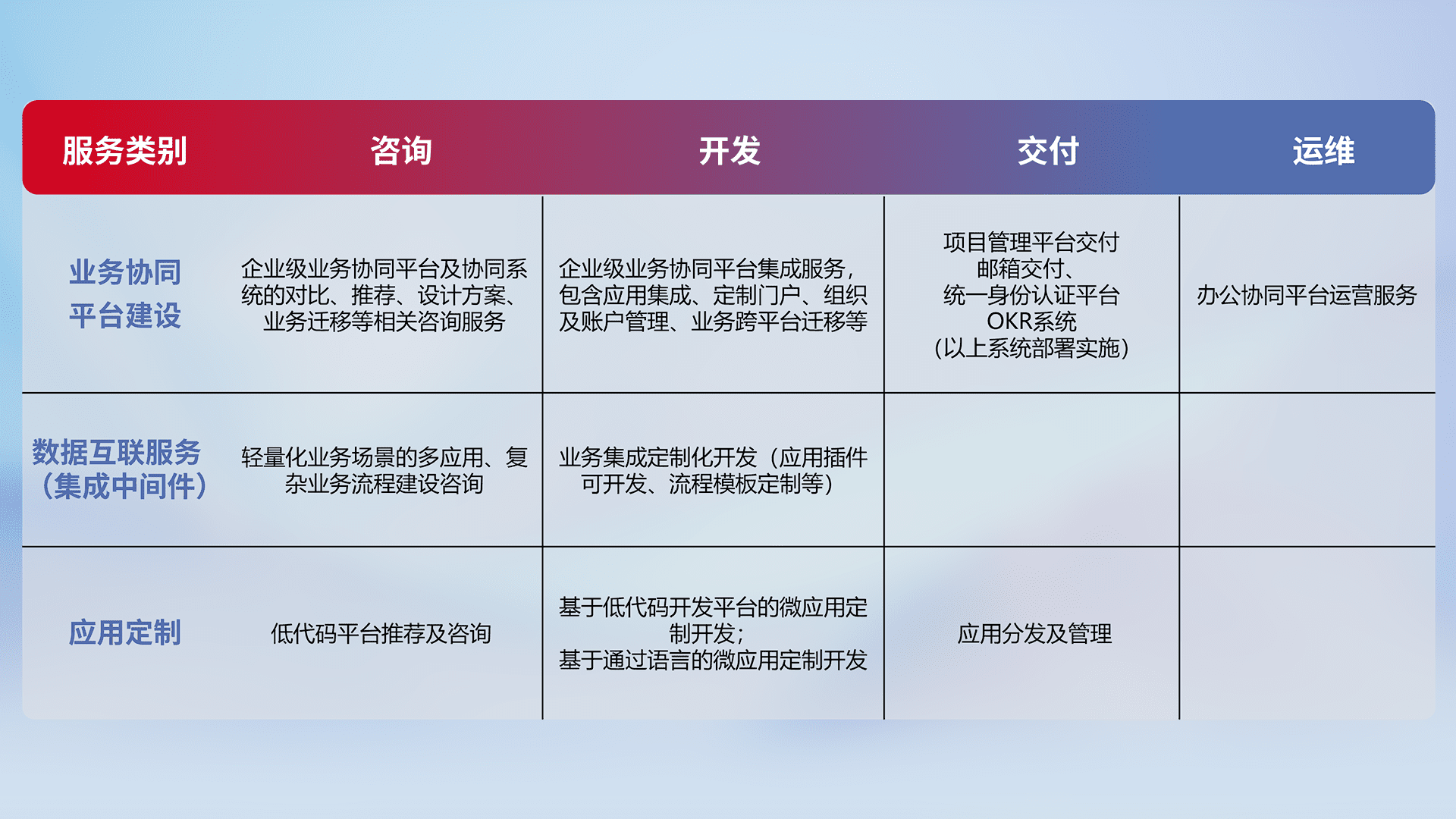 针对钉钉、、、、企微、、、、IDaas等平台级产品提供产品的规划、、、、方案、、、、交付、、、、定制化开发等服务,,,,实现如统一协同办公、、、、智能客户服务、、、混合会议管理、、、、智能数据查询、、、、等业务场景,,,,实现数字化转型。。。。