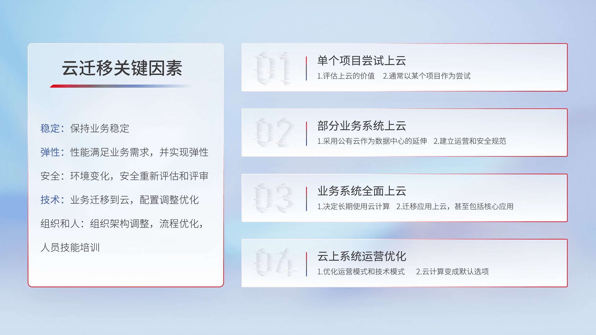 结合实际业务,,从规划设计、、、云平台选型、、、云原生改造、、数据迁移、、、集成交付,,迁移全过程为客户识别最佳上云路径,,,做好风险识别管理,,,设计网络架构、、、、身份权限、、、、安全审计合规、、、、操作审计、、日志审计、、、、监控告警策略、、、、多站点容灾设计等,,,,对云上基础设施进行整体规划,,,,提升IT治理水平,,,,以满足弹性、、高可用、、高性能的需求。。。