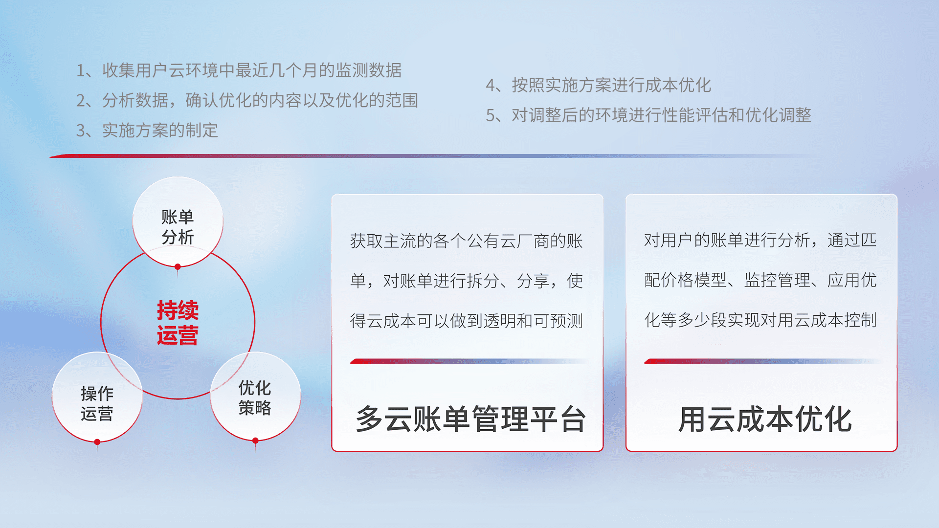 通过多云纳管,,,,以统一的资源数据模型把客户的云资源进行抽象和封装,,,,进而实现对多云资源的统一操作,,保障云资源管理的可靠性、、、、稳定性与可用性。。。量身定制化运维内容,,,,配置、、、、开发运维、、、、补丁管理、、、、备份、、、监控、、、、认证和访问管理、、审计和日常巡检等,,保障在用云过程中的可靠度,,,稳定度以及高可用率。。。。
